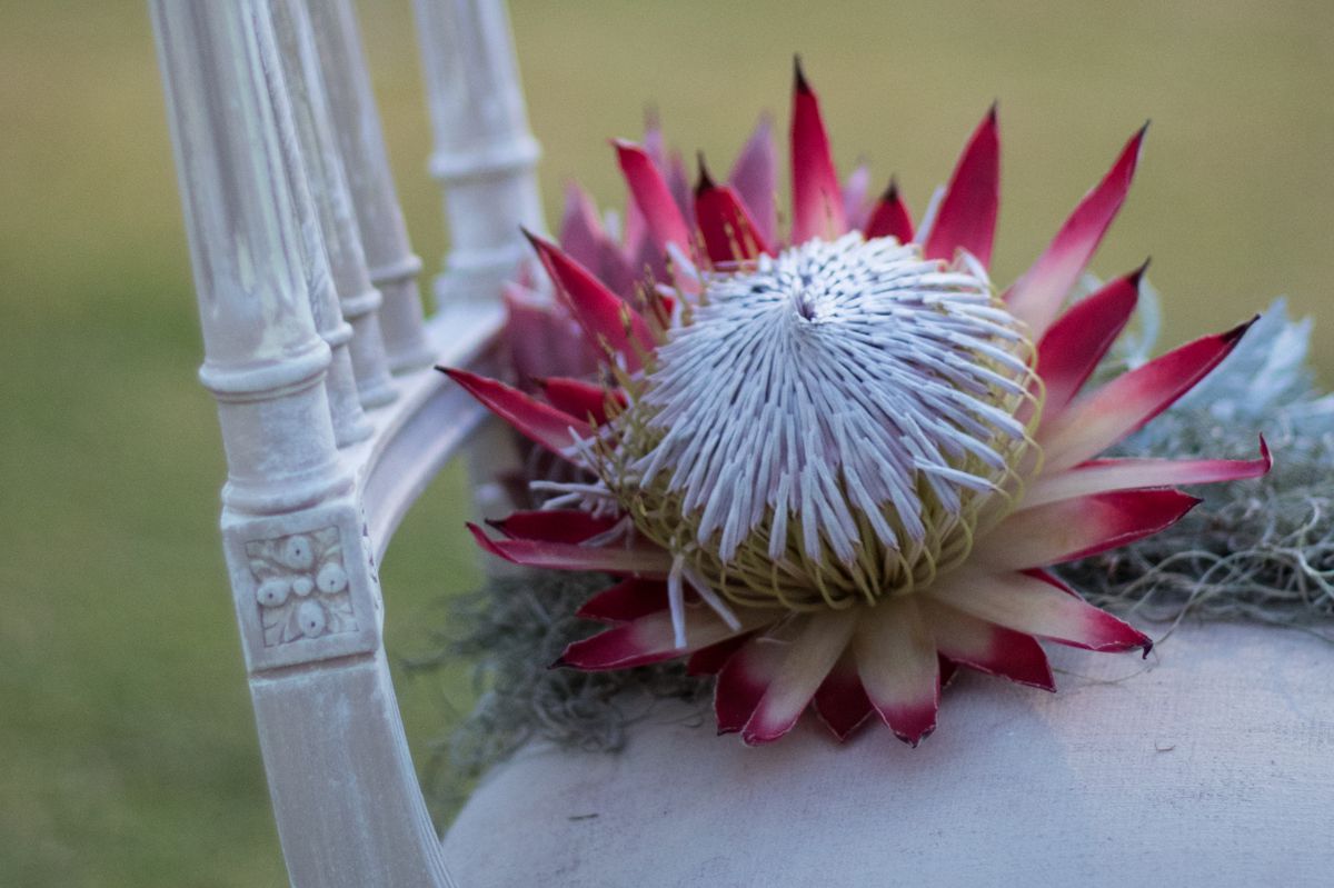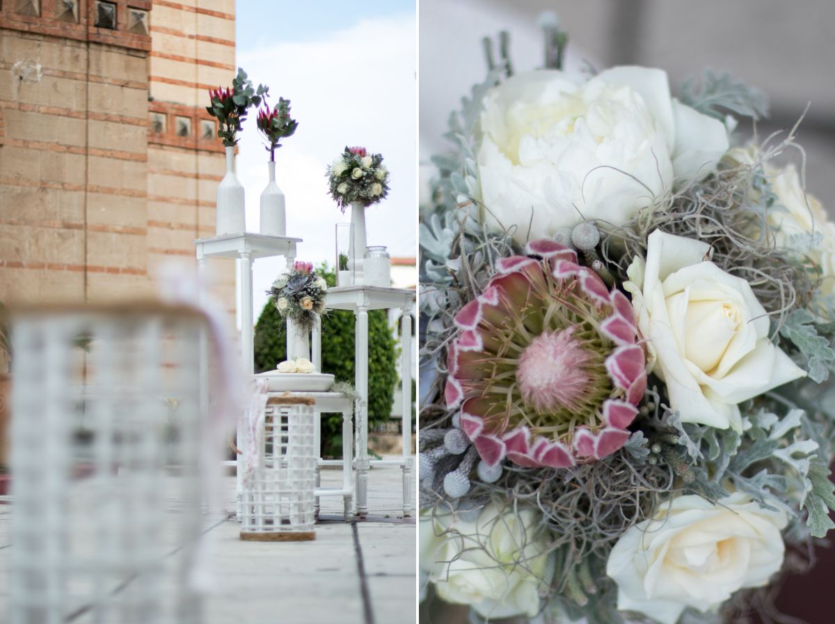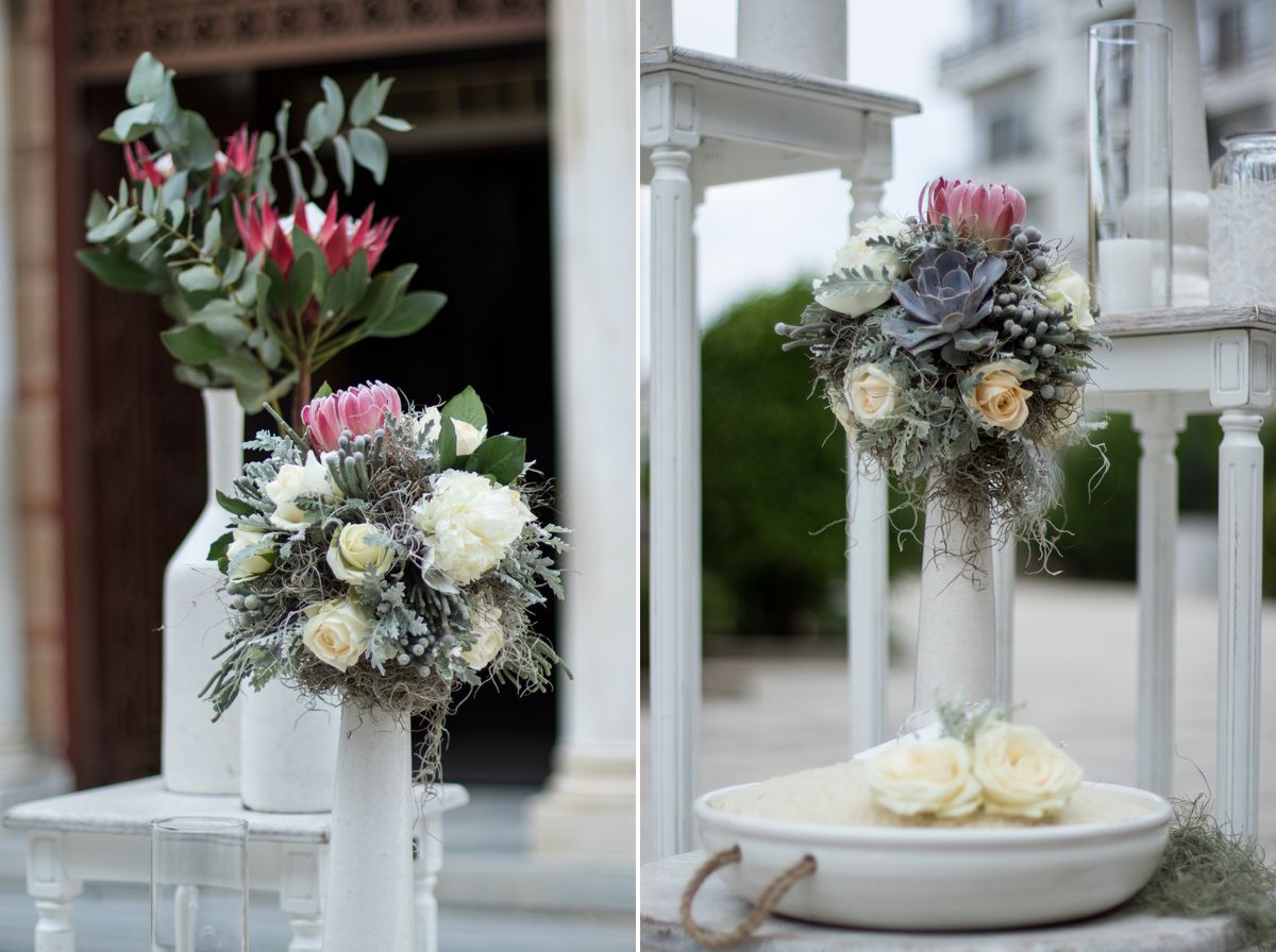 Με ένα γλυκύτατο ρομαντικό στυλ και λεπτομέρεια σε αντικέ δαντέλα, λινό και μοτίβα λαχουριών οργανώσαμε και διακοσμήσαμε τον γάμο και τη βάπτιση της μικρής τους. Ξεβαμμένα λευκά ξύλινα αντικείμενα να τονίζουν ακόμη πιο πολύ το ρομαντικό στοιχείο, και η ομορφιά του εξωτικού πρωτέα που καλλιεργείται στη Κρήτη, να κυριαρχεί ανάμεσα μας.
